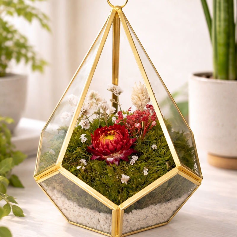 Transforma qualquer espaço num refúgio de beleza eterna. Este terrário geométrico não é apenas decoração — é uma experiência. Com musgo natural preservado e flores naturais sempre vivas, ele traz a natureza para dentro da sua casa sem exigir manutenção, rega ou preocupação. - Elegância minimalista - Beleza que nunca murcha - Um toque de vida que dura anos - Musgo e flores naturais Perfeito para quem quer um ambiente sofisticado, acolhedor e cheio de personalidade. Garante o teu agora e leva uma peça única que nunca perde o encanto. Características: Tipo: Terrário decorativo em vidro geométrico Conteúdo: Musgo preservado e flores secas/estabilizadas Manutenção: Nenhuma Estilo: Minimalista / Elegante Uso: Interior Dimensões: 17 cm (altura) x 11 cm (diâmetro)